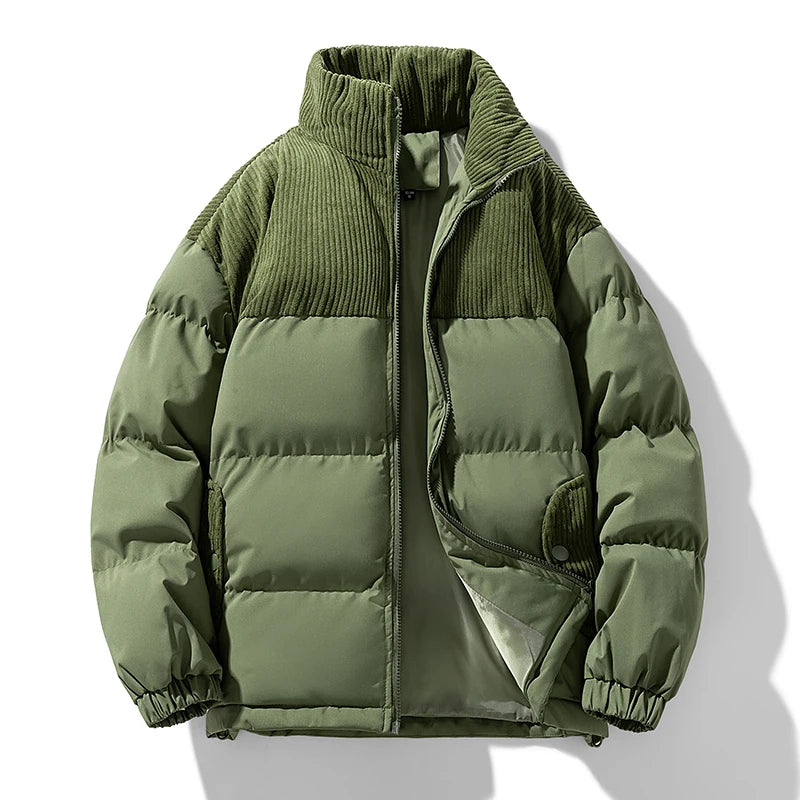 This Quilted Puffer Jacket merges rugged style with winter comfort. Featuring a textured corduroy yoke and collar, it offers warmth and wind resistance. With deep buttoned pockets and eco-friendly insulation, it's built for cold-weather versatility.